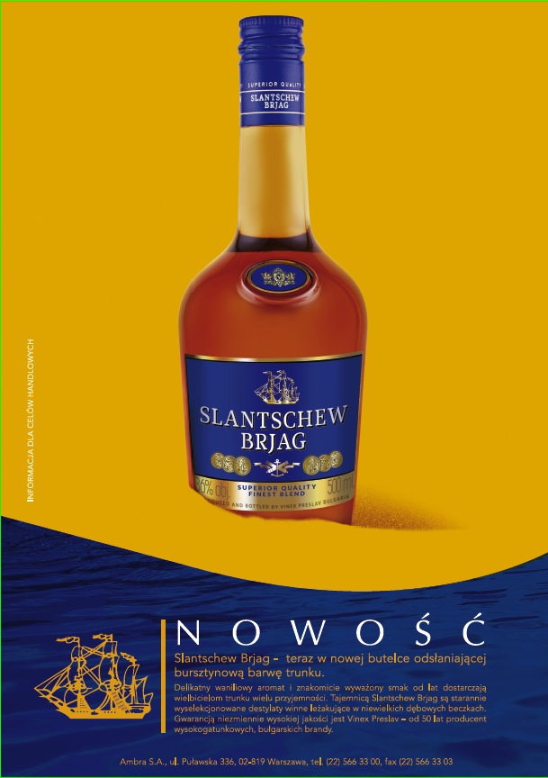 Slantschew Brjag – którego tajemnicą są starannie wyselekcjonowane destylaty winne leżakujące w niewielkich dębowych beczkach – zyskał zupełnie nowe opakowanie. Zmieniona butelka odsłania doskonałą bursztynową barwę trunku, przenosząc nas w świat morskich opowieści. Jej design nawiązuje do koloru wzburzonych fal i rozgrzanego słońcem złotego piasku. Ten sam pozostał wyważony smak Slantschew Brjag z subtelnym waniliowym aromatem. Na straży tradycyjnej technologii produkcji stoi Vinex Preslav – od 50 lat producent wysokogatunkowych, bułgarskich brandy.